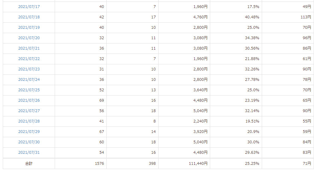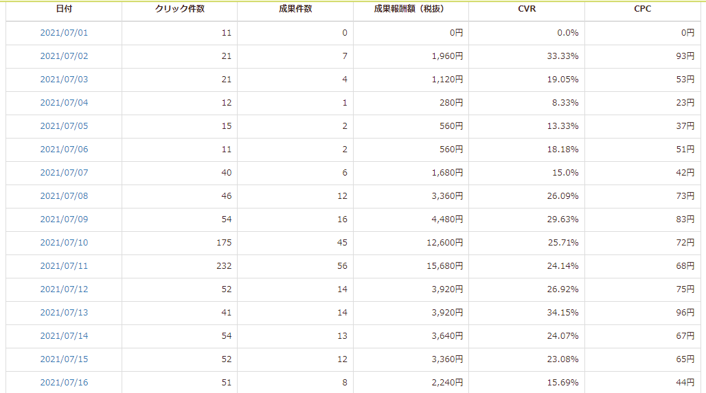 掲載依頼をいただいた案件は単価は高くないものの、アクセスを集めている記事にはベストマッチであるため、訴求文をいくつか試していった結果、7月に入り毎日ポツポツと成約をいただけるようになりました↗